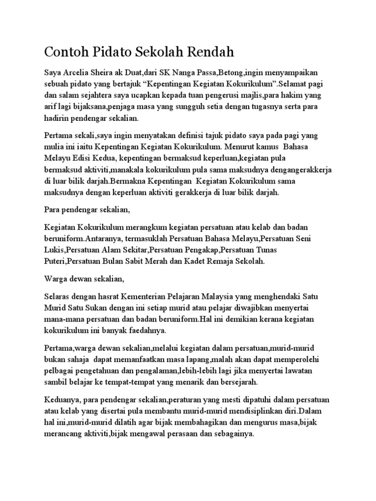 Saya Arcelia Sheira ak Duatdari SK Nanga PassaBetongingin menyampaikan sebuah pidato yang bertajuk Kepentingan Kegiatan KokurikulumSelamat pagi dan salam sejahtera saya ucapkan kepada tuan pengerusi majlispara hakim yang arif lagi bijaksanapenjaga masa yang sungguh setia. Pidato tentang kurangnya minat membaca sketsa. Contoh teks pidato sekolah rendah contoh skrip pidato sekolah menengah.